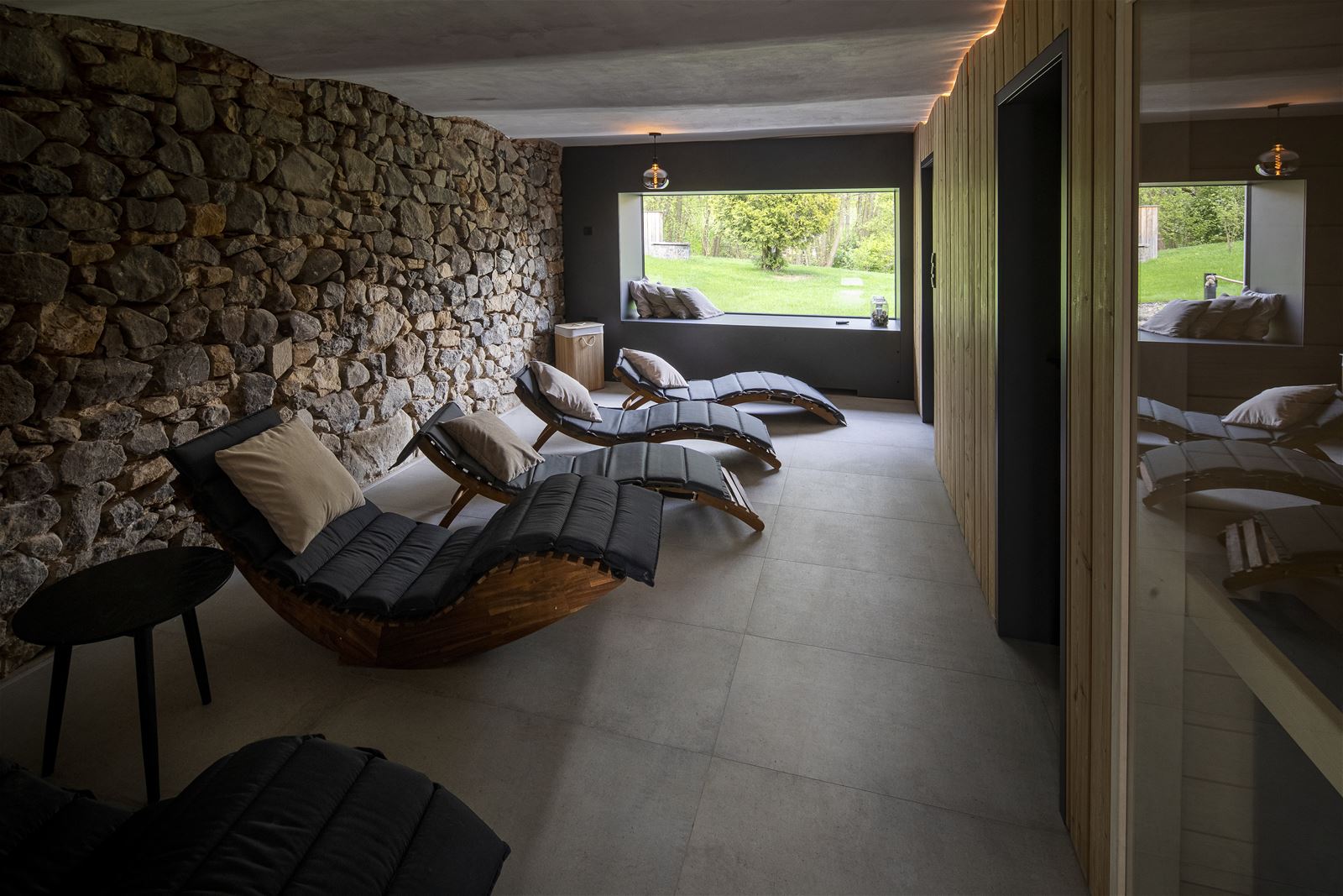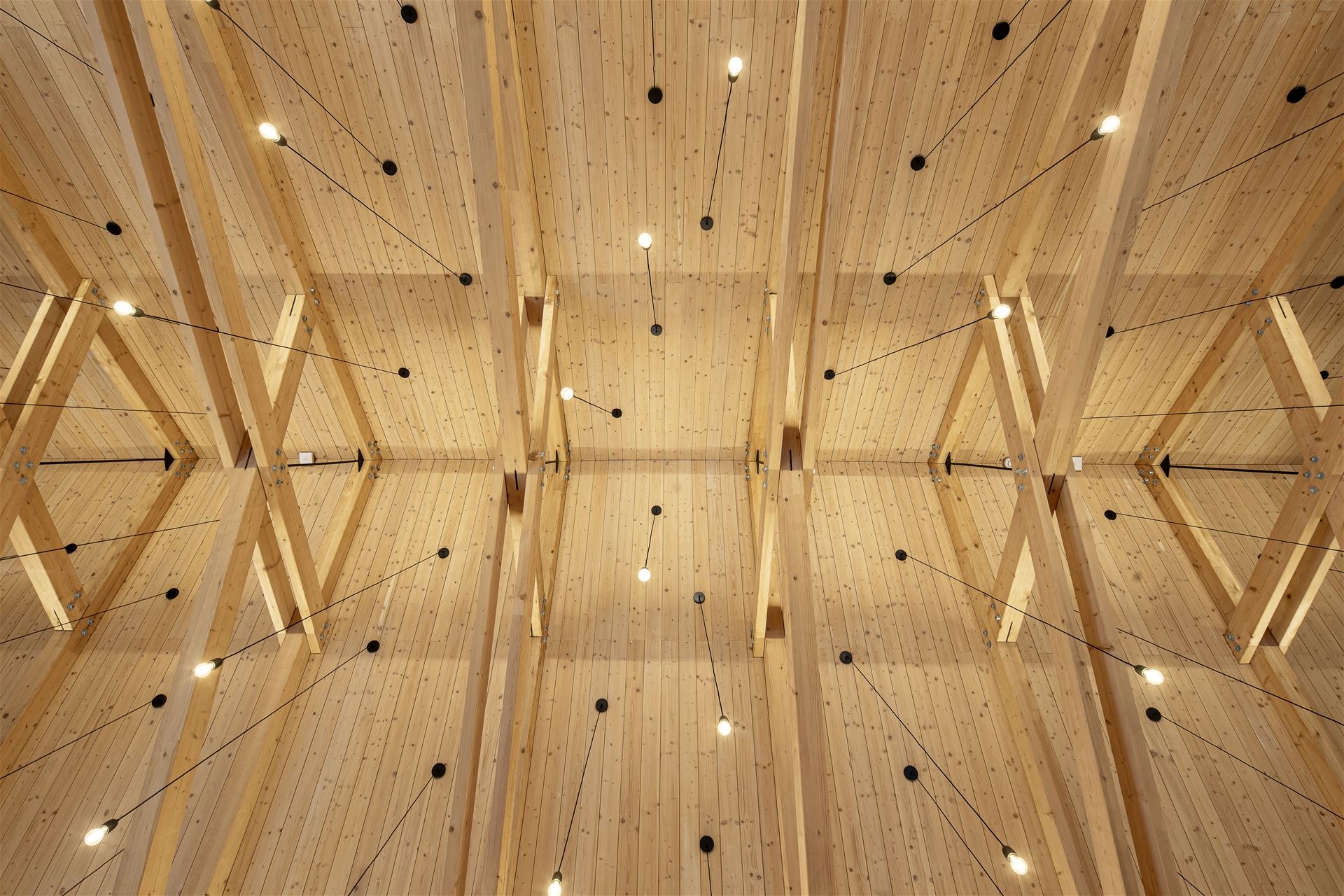 Interiéru dominuje společenský sál, který těží z přiznané krásy otevřené konstrukce dřevěného nůžkového krovu. Prostor je osvětlen desítkami drobných světel zavěšených pod stropem, které vytvářejí dojem hvězdného žárovkového nebe.