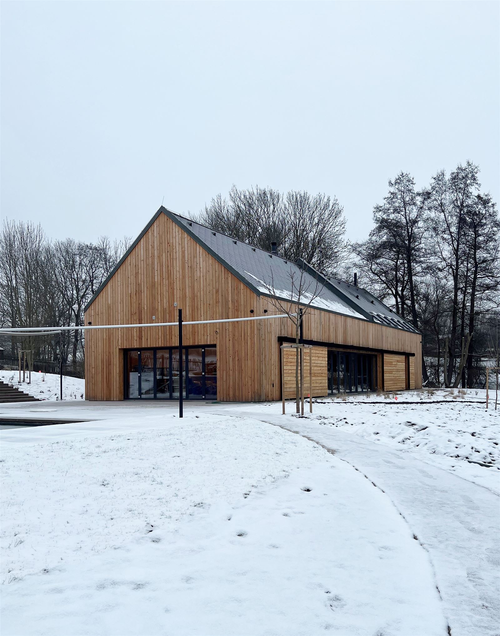 Čelní strany sálu jsou obloženy cihlovými pásky v klasické červené barevnosti, v podkrovních pokojích se motiv opakuje v bílé variantě. Přízemí nabízí otevřený sál s barem, sociální i technické zázemí se skladem. Tato obslužná část budovy ze severní strany disponuje samostatným vstupem a je zde také umístěno schodiště do podkroví. Pod střechou se nachází tři hostinské pokoje, každý s vlastní koupelnou a malou předsíní. Prostor osvětlují střešní okna orientovaná na sever a jih.