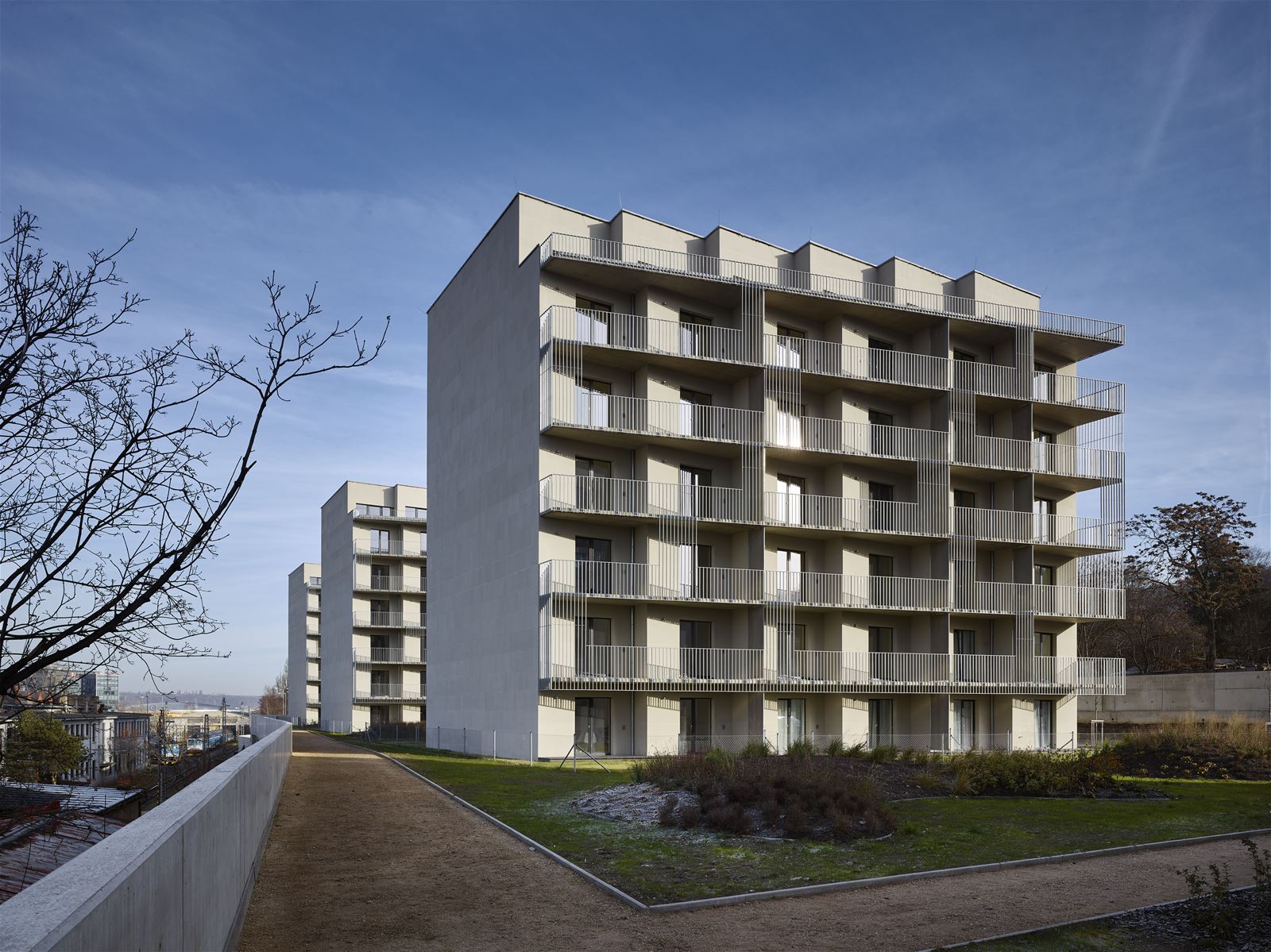 Pět domů, vyskládaných v řadě na jedné společné parkovací podnoži, je vklíněno mezi kolejiště Libeňského nádraží a Novovysočanskou ulici. Historicky se jedná o místo bývalé nouzové a později zahrádkářské kolonie Krejcárek. Nový obytný soubor navazuje na vrstevnatou historii lokality a současně nabízí moderní městské bydlení. Charakter místa definují všudypřítomné linie lidských cest, které striktně vymezily prostor výstavby. I proto jsme je symbolicky vtiskli do reliéfu omítek a v dalších podobách se objevují v designu celého pětidomí.