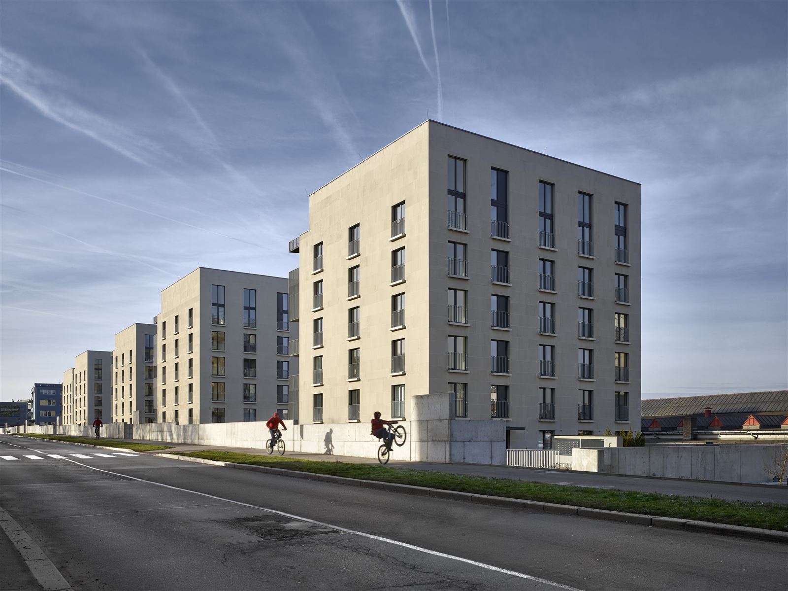 Každý z domů dosahuje výšky pěti plných a jednoho mezonetového podlaží. Jihozápadním fasádám dominuje předsazená ocelová konstrukce s balkony. Zábradlí a dělící stěny tvoří svislé kovové pásy.