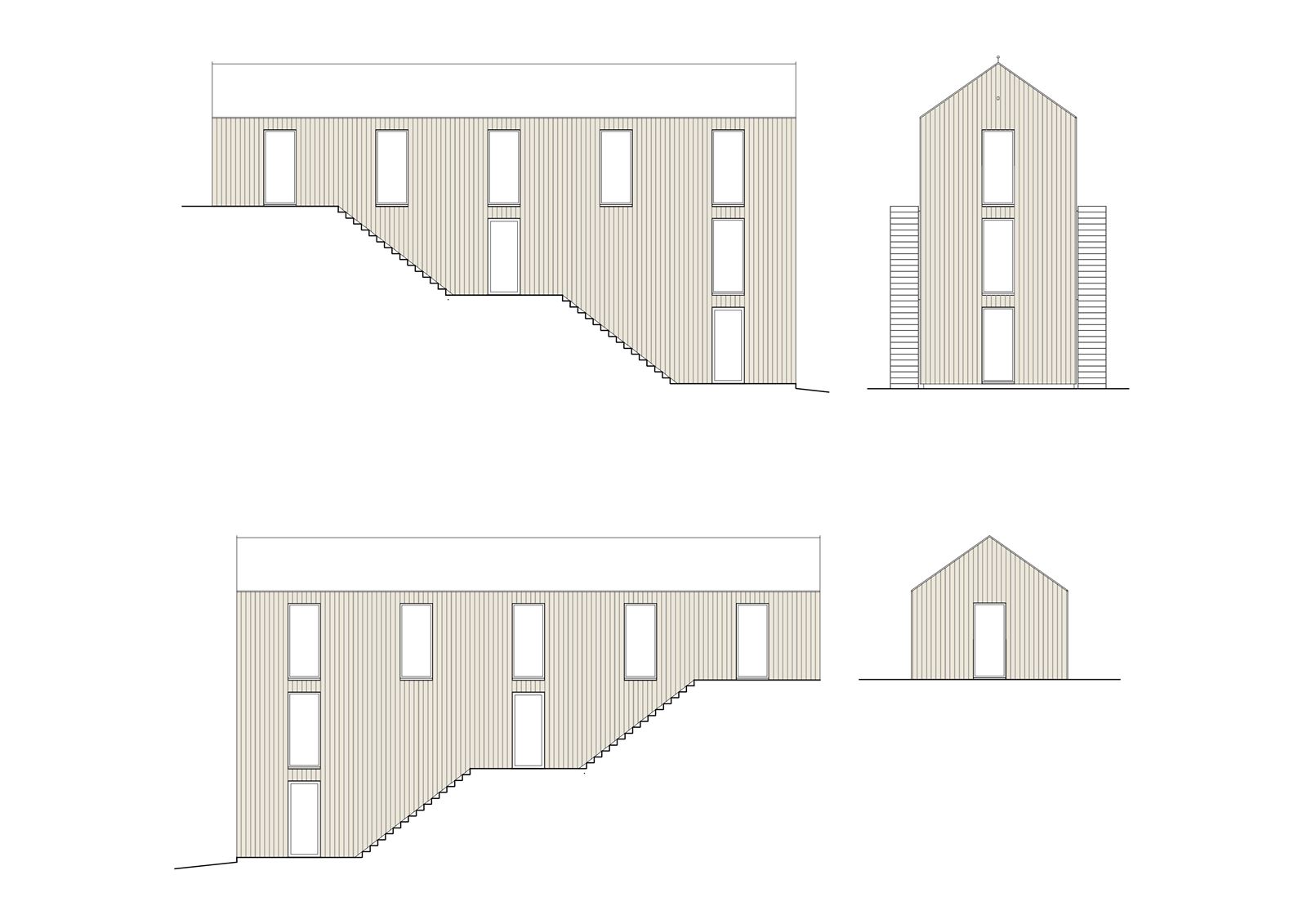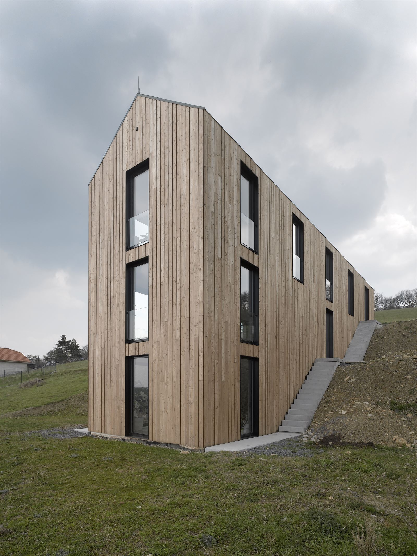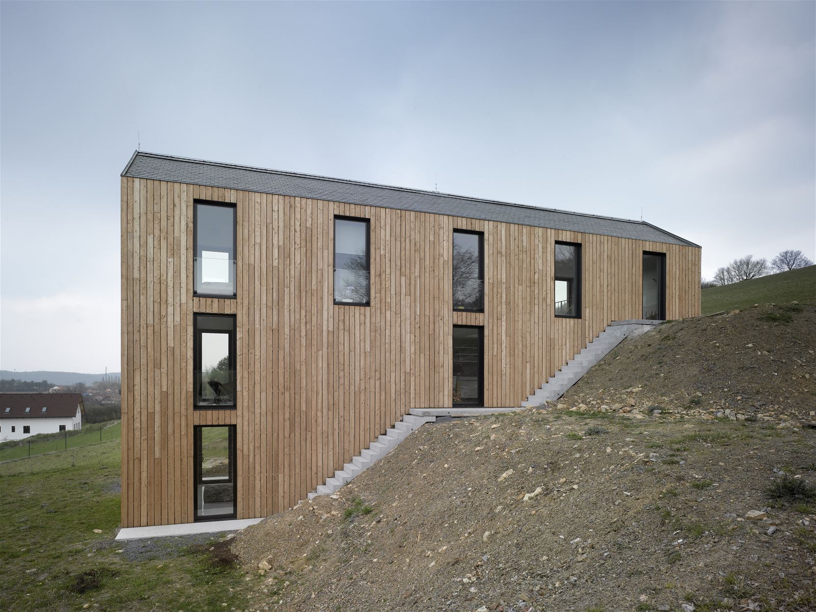 Stavba má podobu jednoduché, lineární hmoty, která je částečně zapuštěná do prudkého severního svahu. Ten však není nevítaným limitem nebo omezením, naopak dům jej ochotně následuje, kopíruje jeho spádnice a dál se na všech svých úrovních otevírá směrem k pohledům do širokého okolí.