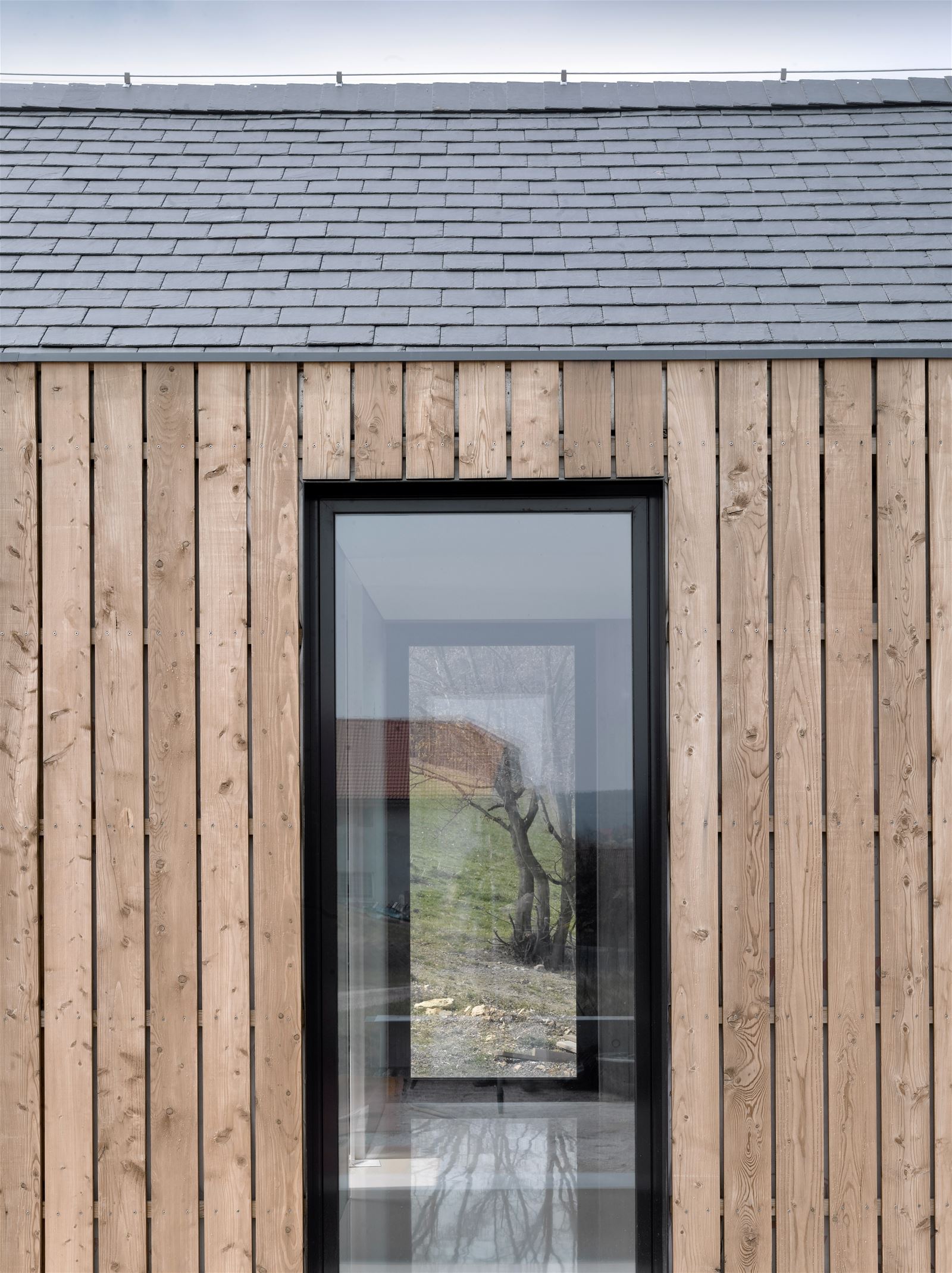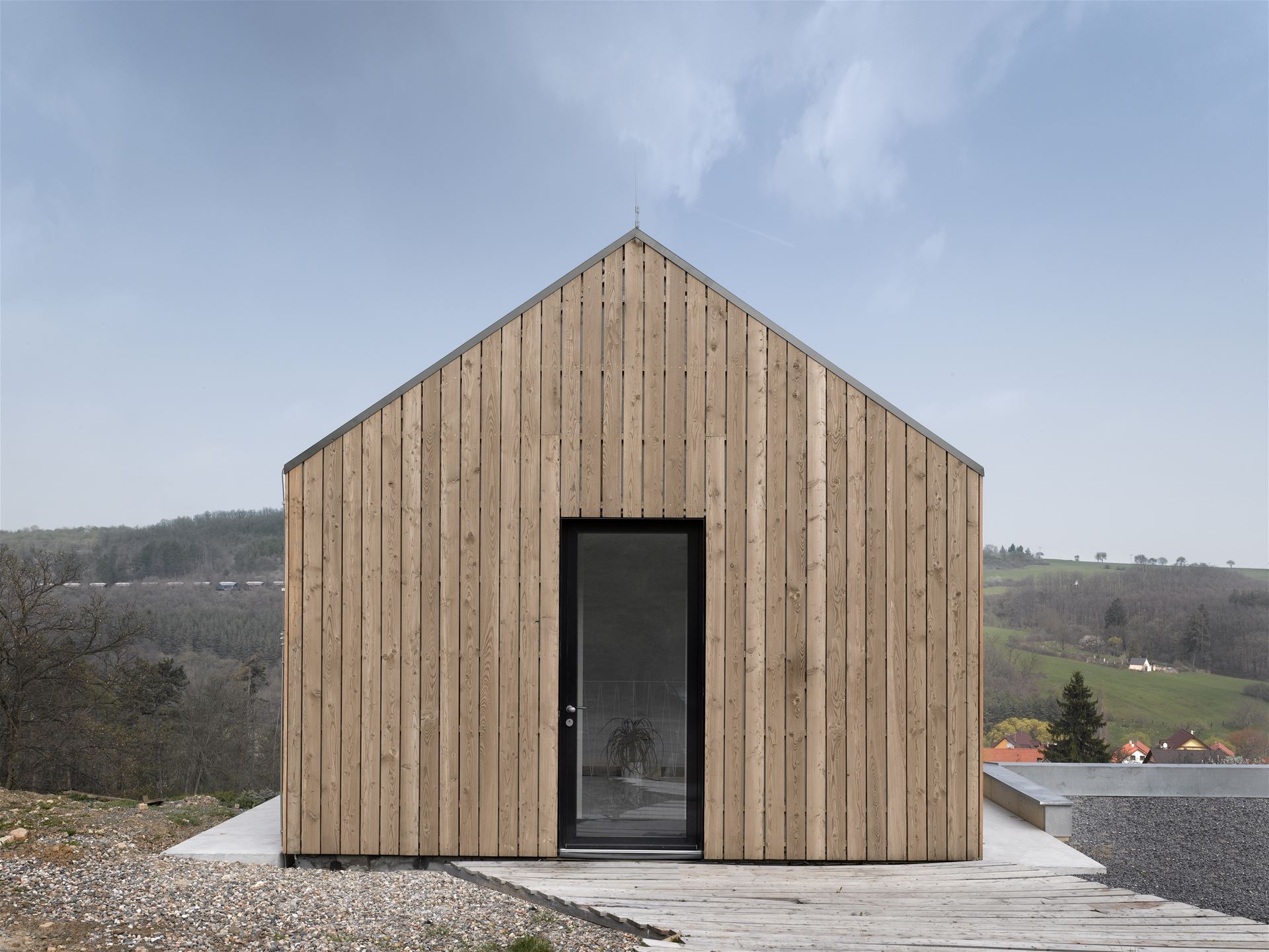 Obvodový plášť je obložen neupravovaným modřínovým řezivem bez nátěru, které přirozeně stárne. Střechu kryje černý břidlicový šindel. Hliníková okna jsou v antracitové úpravě.