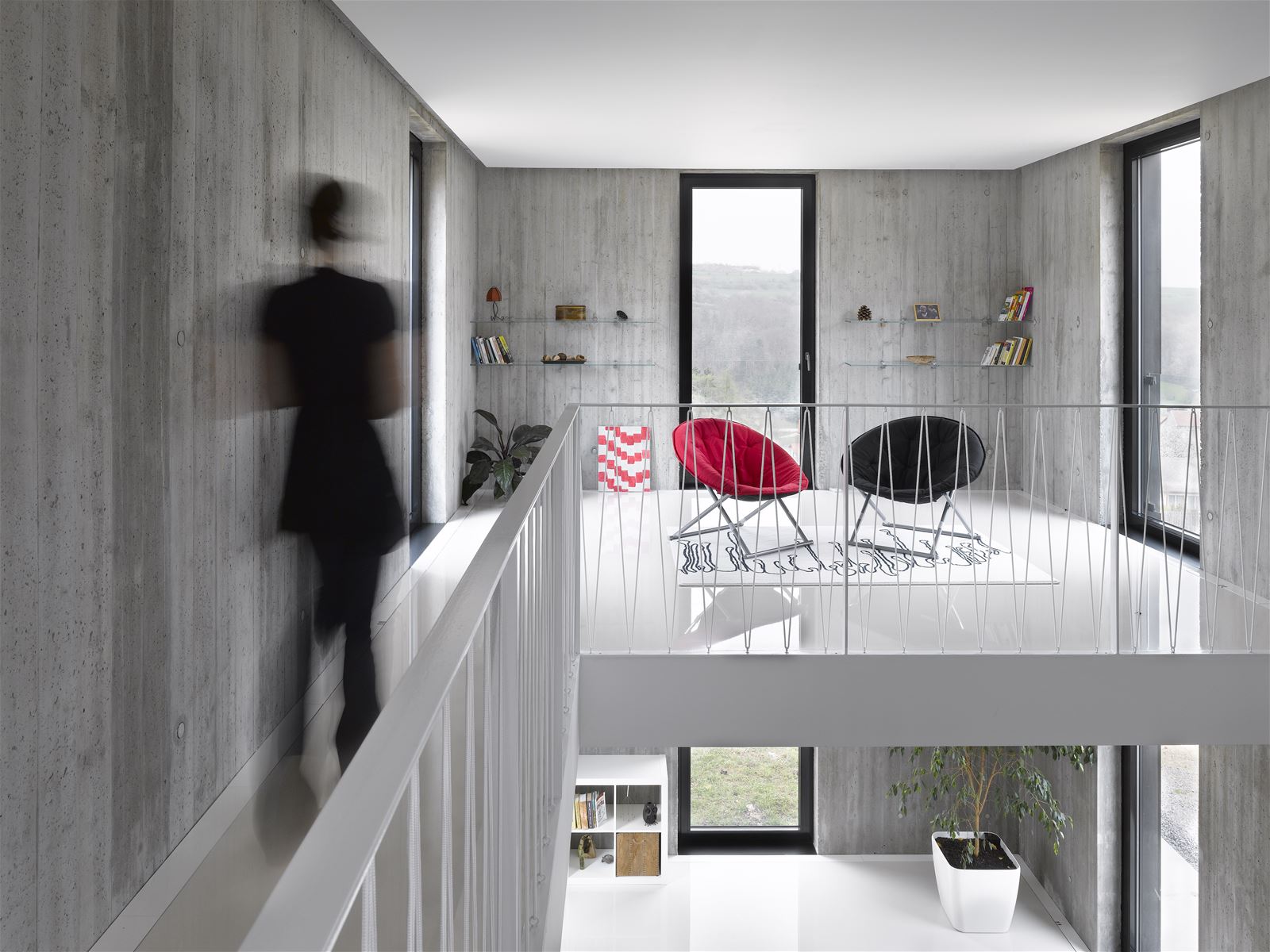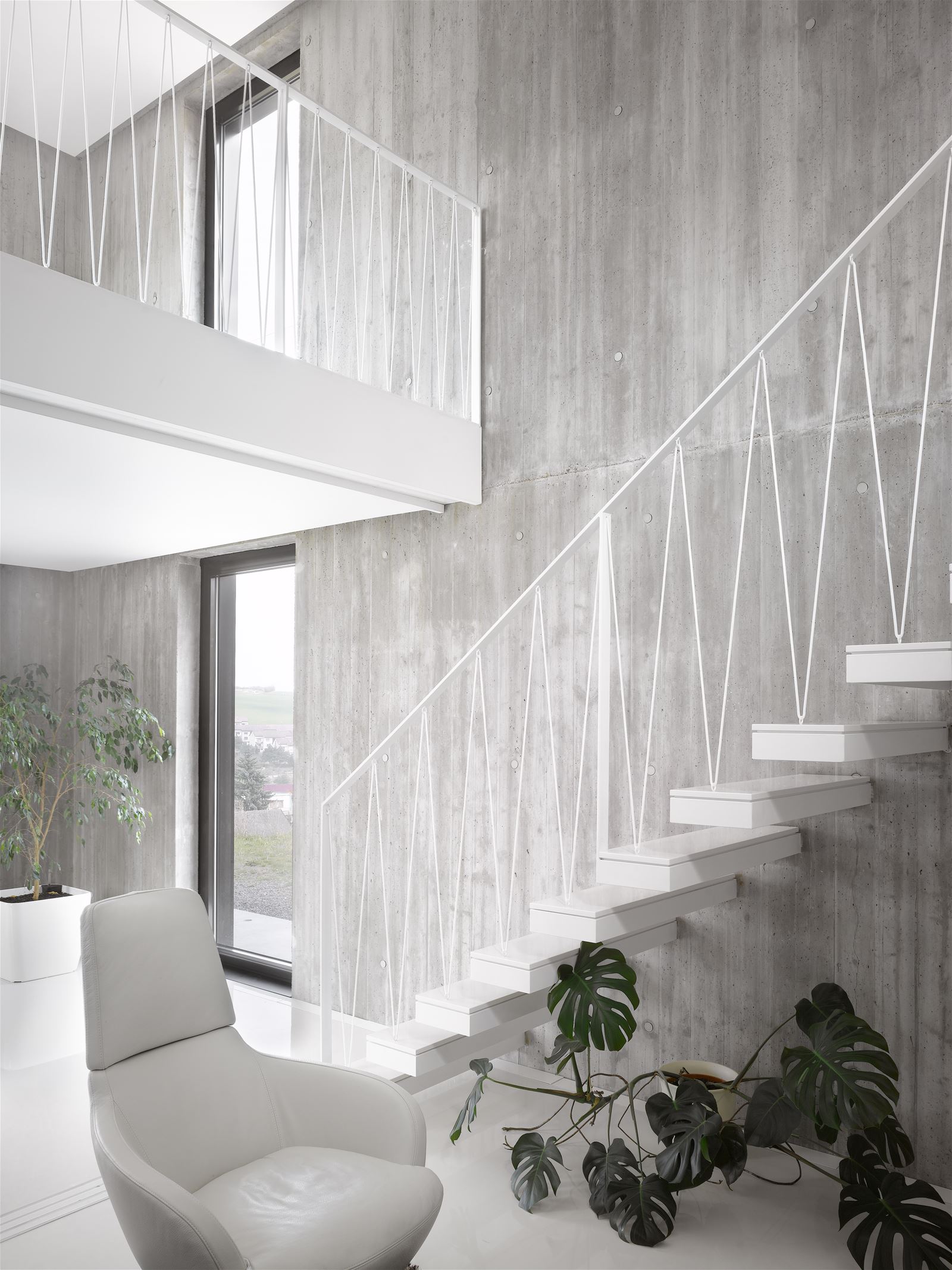 Veškeré detaily pracují s jednoduchými materiály ve své přiznané formě. V interiéru se uplatňuje kontrast surového betonu, dřeva a bílé epoxidové stěrky.