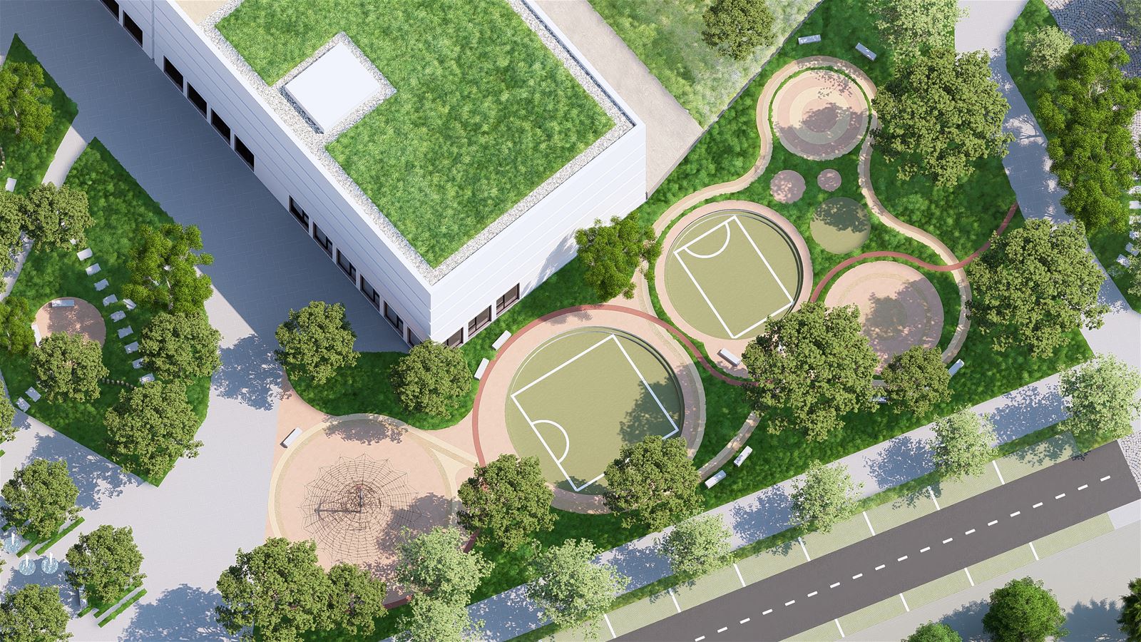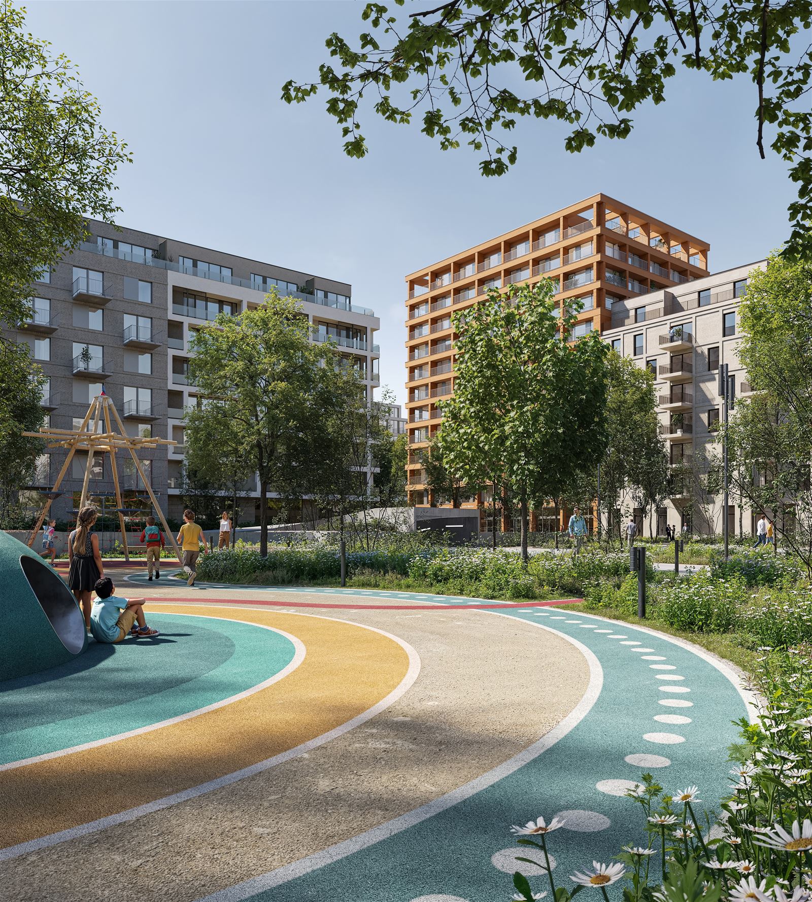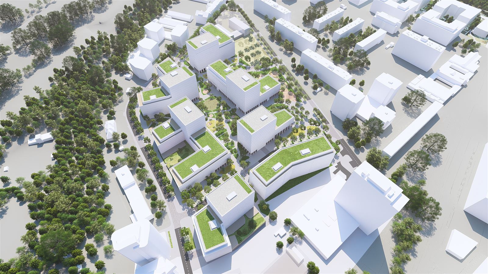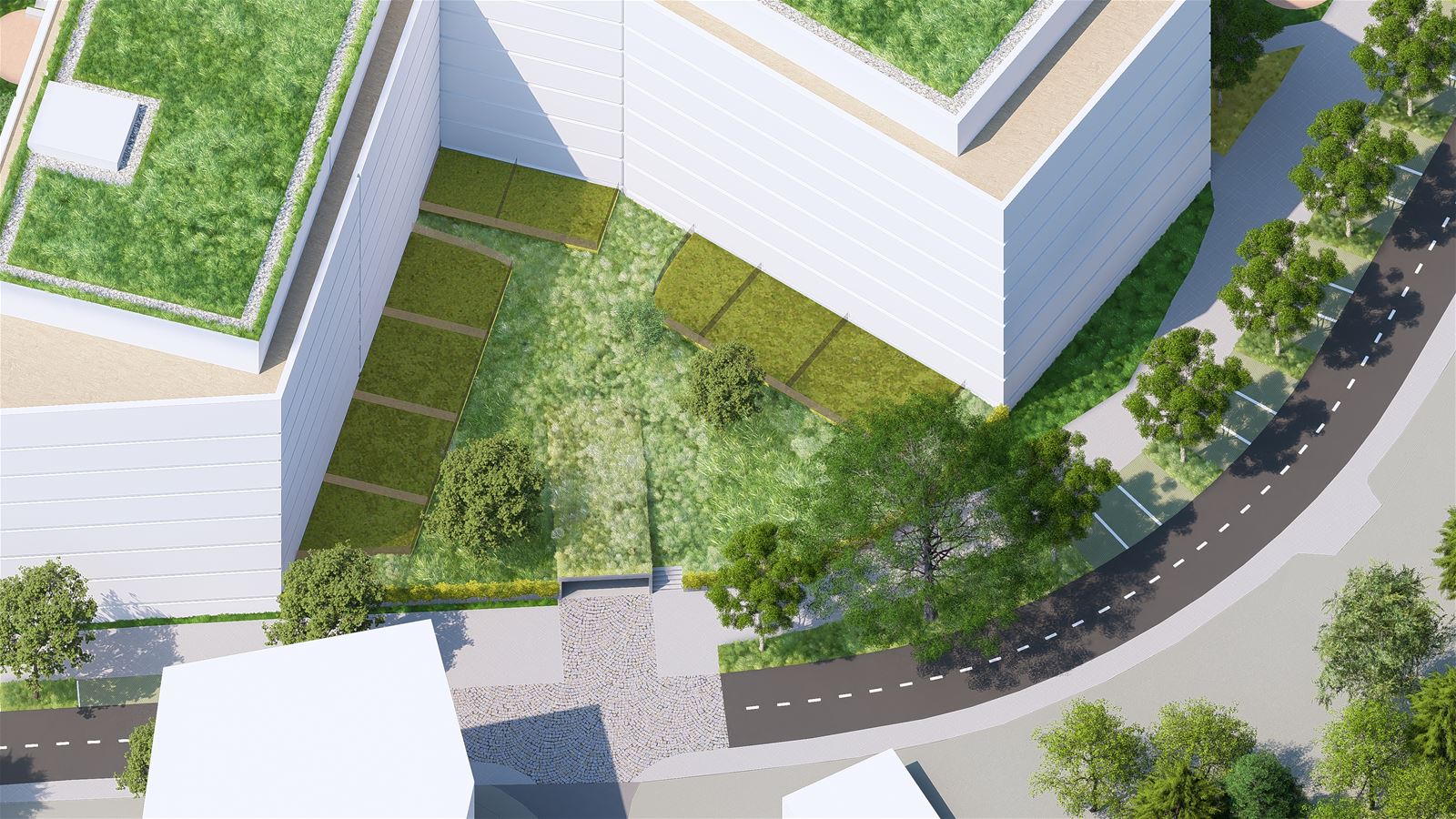 Návrh nové čtvrti ve východní části Karlína, v přímém sousedství sídliště Invalidovna. Na ploše bývalého sportoviště je územním plánem předpokládaná zástavba odpovídající koeficientu podlažních ploch I=2,6. Tato kapacita definuje nutnost hledání svébytné struktury, která nemůže nést stejné atributy jako sousední modernistické sídliště. Zároveň pro její uspořádání využíváme spíše tvarosloví klasického města, abychom dokázali vytvořit přesvědčivou podobu veřejných prostranství. Na vnějším okraji přesto dodržujeme princip zeleného města a frázujeme okrajové komunikace střídáním budov a zeleně. Vysoká hustota obyvatel (600 obyv./ha) umožňuje definovat dostatečné množství aktivního parteru a tím oživit veřejná prostranství. Geometrie území zachovává ortogonalitu sousední struktury, částečně je však ovlivněna i geometrií cestní sítě sídliště. Právě cesta od zastávek MHD, sdružených u metra Invalidovna a její prodloužení vnáší do struktury prvek obracející se k vnějšímu světu.Vědomi si regulativu zeleného parku vytváříme centrální prostor ve formě parku. Park je propojen s navazujícími subprostory, které mají intimnější charakter a vytvářejí komponovanější strukturu prostranství. Stejně tak uspořádání budov sleduje principy „města podle uměleckých zásad“ a snaží se průhledy uzavírat a komponovat.
