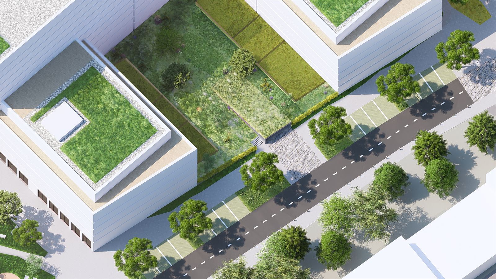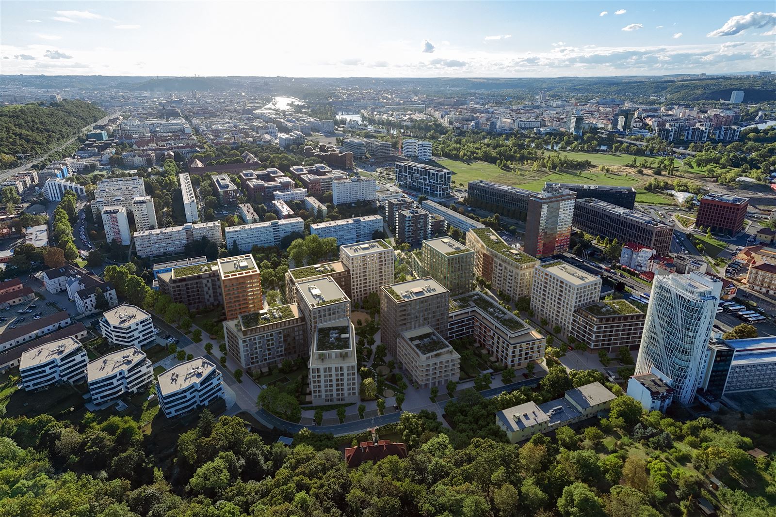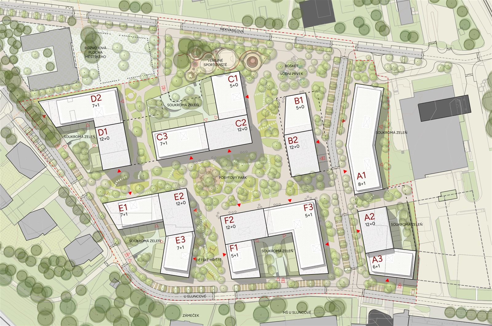 Krajinářský koncept spočívá ve využití navržené koncepce veřejných prostranství a jejich hierarchie pro pojmenování principů řešení zeleně. Výsadby a materiálové řešení veřejných prostranství jsou sjednoceny pomocí systému zelených ostrovů. Ty se v úrovni chodníku rozprostírají celým územím, zlepšují mikroklima, podporují vsakování a zadržování dešťové vody (v souladu s principy HDV) a zároveň vytvářejí pestrou škálu pobytových míst, od vymezených kruhových louček mezi keři s možností sezení, až po výraznější stromové celky s trávníky a rekreační využití. Intimnější zákoutí jsou přístupná šlapáky v trávě nebo parkovými cestami. Ve veřejném prostoru je kladen důraz na přehlednost, prostupnost a přirozenou sociální kontrolu. Doplňkově jsou použity klasické prvky jako alej či bosket, a to zejména pro formální veřejná prostranství jako je vstupní náměstí či ulice.